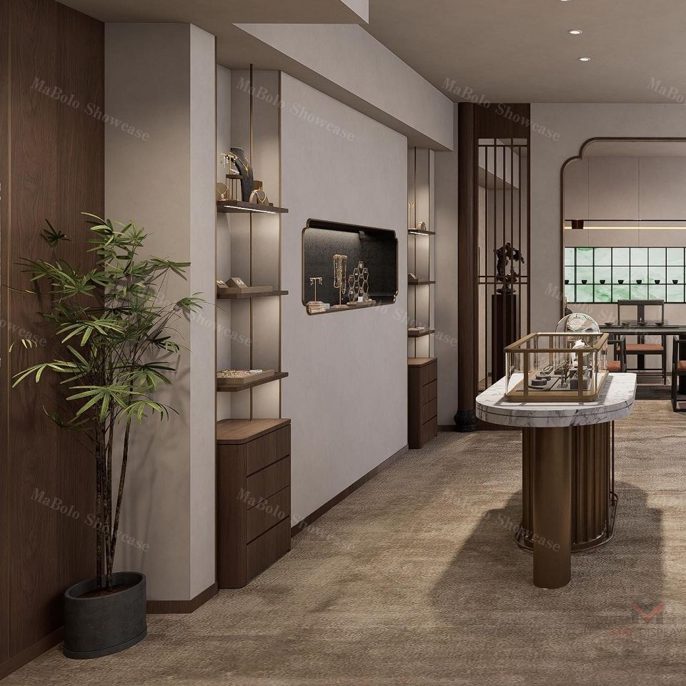 Keywords: New Chinese jewelry store entrance, artistic reception area, central display island, atmosphere creation