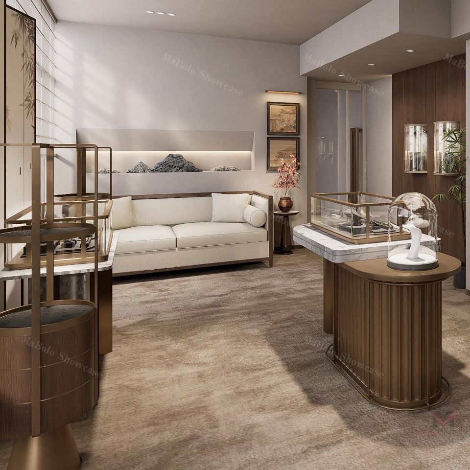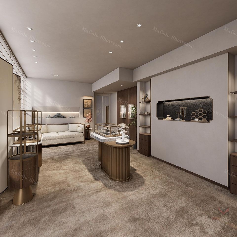 This area blurs the absolute boundary between display and consultation. A low-profile, comfortable sofa forms the core of the consultation space. Innovatively placed beside it is a dual-height display unit-combining a glass vitrine and an independent sculptural pedestal-for presenting core collections. The layering of art pieces, stone accents, and warm lighting allows high-value transactions to occur naturally within an atmosphere rich in artistic and cultural appeal.