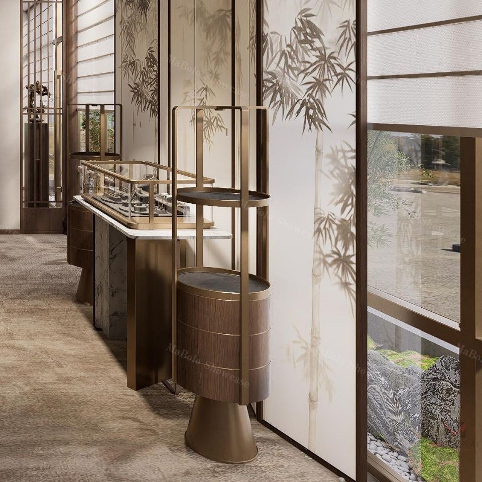 The heart of the space is a complete display zone featuring borrowed scenery from a courtyard. Expansive floor-to-ceiling windows draw the outdoor courtyard view inside. Filtered through perforated bamboo-textured screens, the light becomes soft and rhythmic. The marble main display counter with bronze components becomes the visual focus, while the semi-enclosed lounge area on the side ensures privacy and comfort for browsing, achieving a harmonious dialogue between nature, architecture, and jewelry.