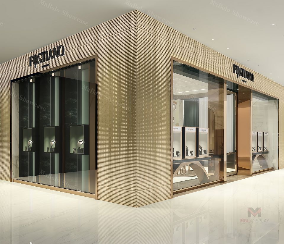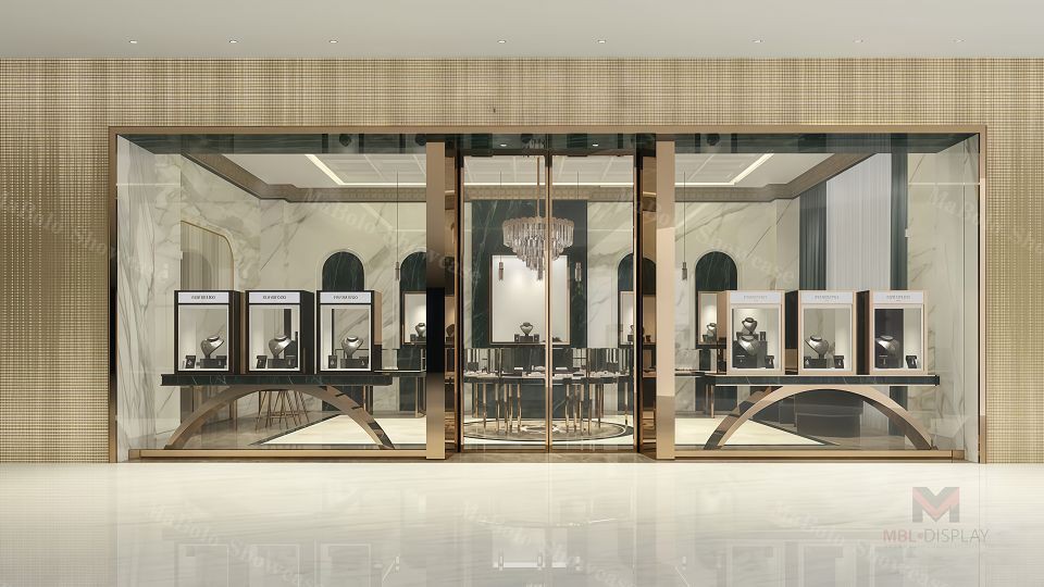 This case study focuses on the high-end jewelry store design created by the MBL Display team, which precisely matches the visual and functional needs of luxury jewelry brands. By deeply integrating champagne gold metal lines, natural marble textures, and modern light luxury aesthetics, the design successfully solves the core problem of brands balancing luxury texture, exhibit display efficiency, and customer experience in the space.