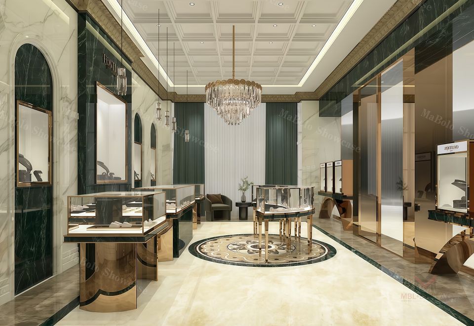 In the design of this high-end jewelry store, the MBL Display team closely aligned with the brand's light luxury and luxury demands, taking champagne gold as the core visual element and combining marble with dark green stone to build spatial layers. The approximately 80-square-meter space is divided into three functional sections: the window image area, the core display area, and the VIP negotiation area. The exquisite texture of metal is integrated with the natural heritage of stone, and champagne gold runs through the space as the main line instead of being a mere decoration, greatly enhancing the high-end tone of the space and the customer's immersive shopping experience.